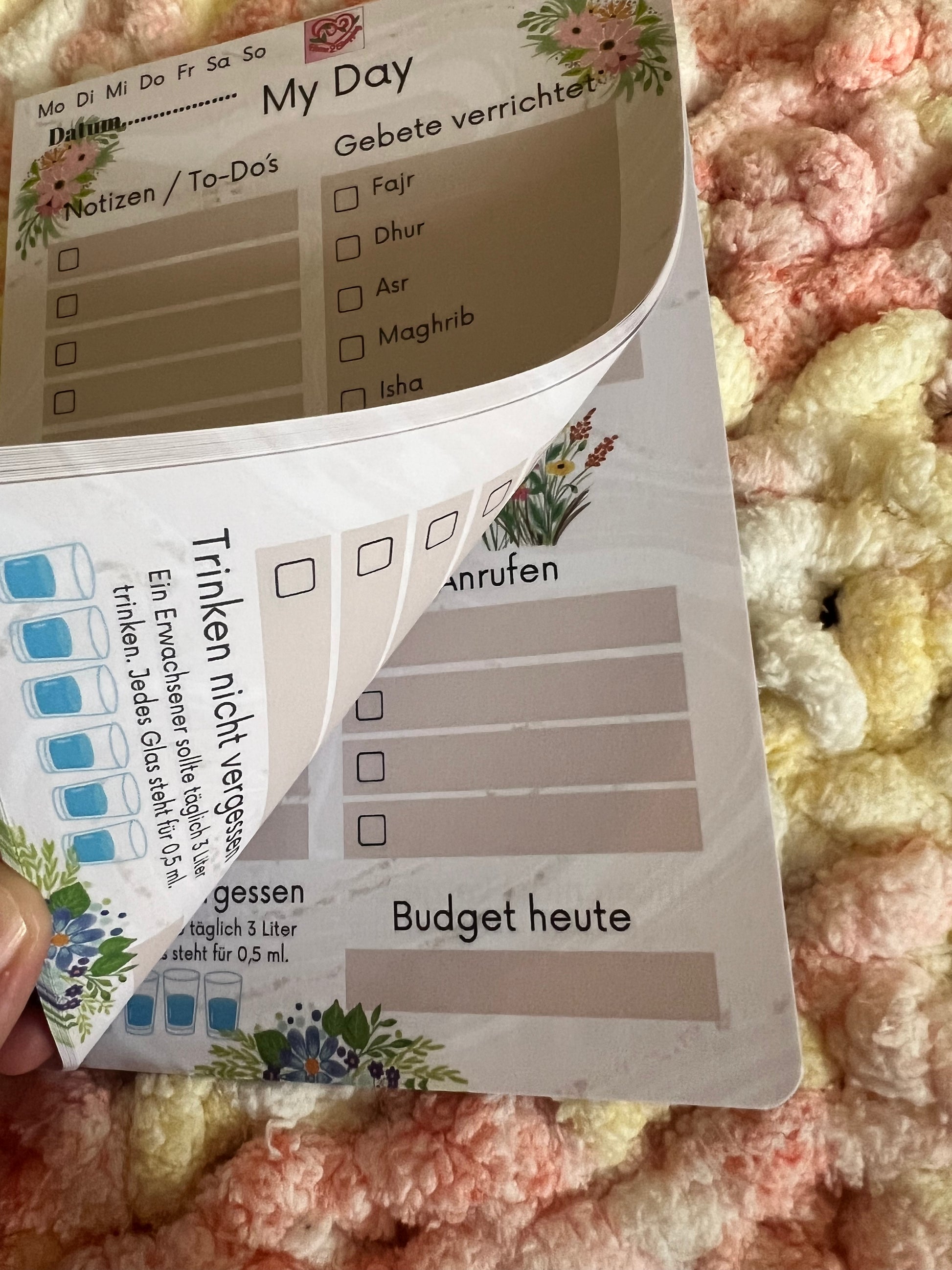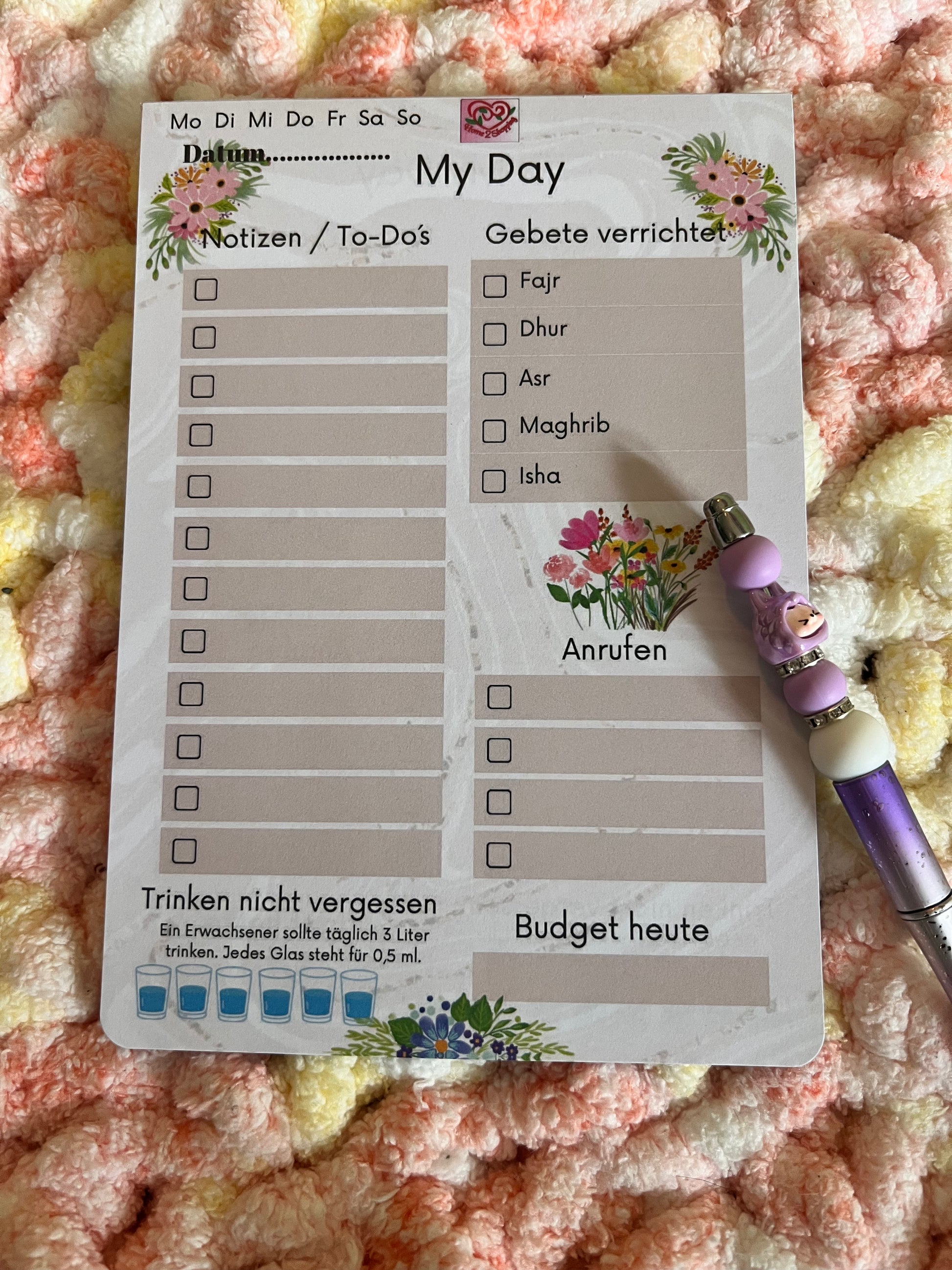Der liebevoll gestaltete „My Day“-Notizblock hilft dir, deine Gebete, Aufgaben und täglichen Routinen im Blick zu behalten – mit Platz für To-Dos, Anrufe, Trinkmenge und Budget. Perfekt für Alltag, Arbeit oder als Geschenk.